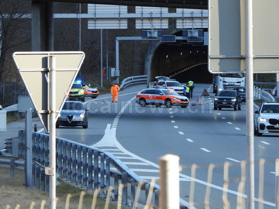 Moto contro un'auto ferma in colonna sull'A2 all'uscita di Monteceneri, martedì 24 febbraio 2026, ore 08:00