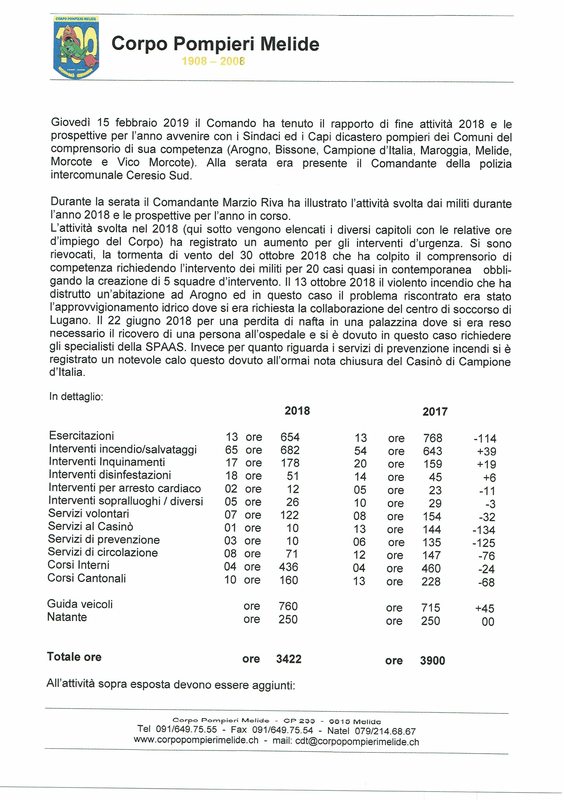 in allegato il comunicato stampa e alcune immagini riguardanti il rapporto annuale del Corpo Pompieri Melide, presentato venerdì 15 febbraio 2019 alle autorità politiche del comprensorio di competenza. Vi chiediamo cortesemente di pubblicarlo sui vostri quotidiani e pagine web.